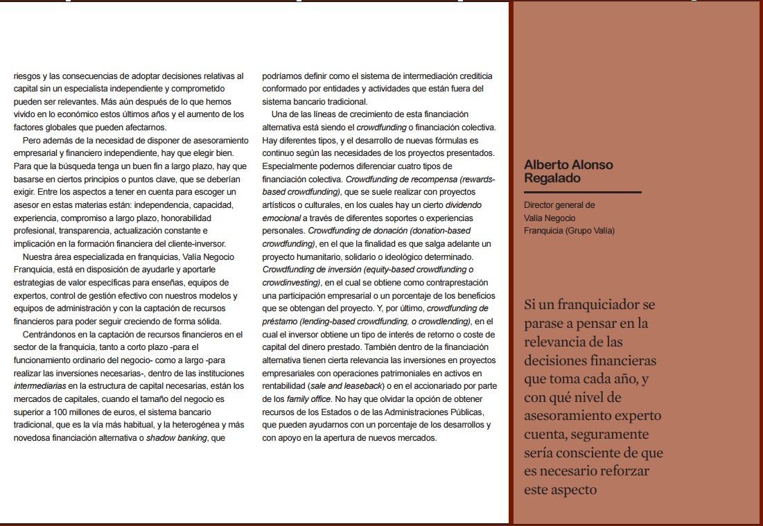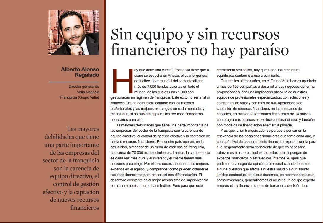 «Sin equipo y sin recursos financieros no hay paraísos» Artículo del Director General de GRUPO VALÍA, Alberto Alonso Regalado en el elEconomista.es «Las mayores debilidades que tiene una parte importante de las empresas del sector de la franquicia son la carencia de equipo directivo, el control de gestión efectivo y la captación de nuevos recursos financieros».